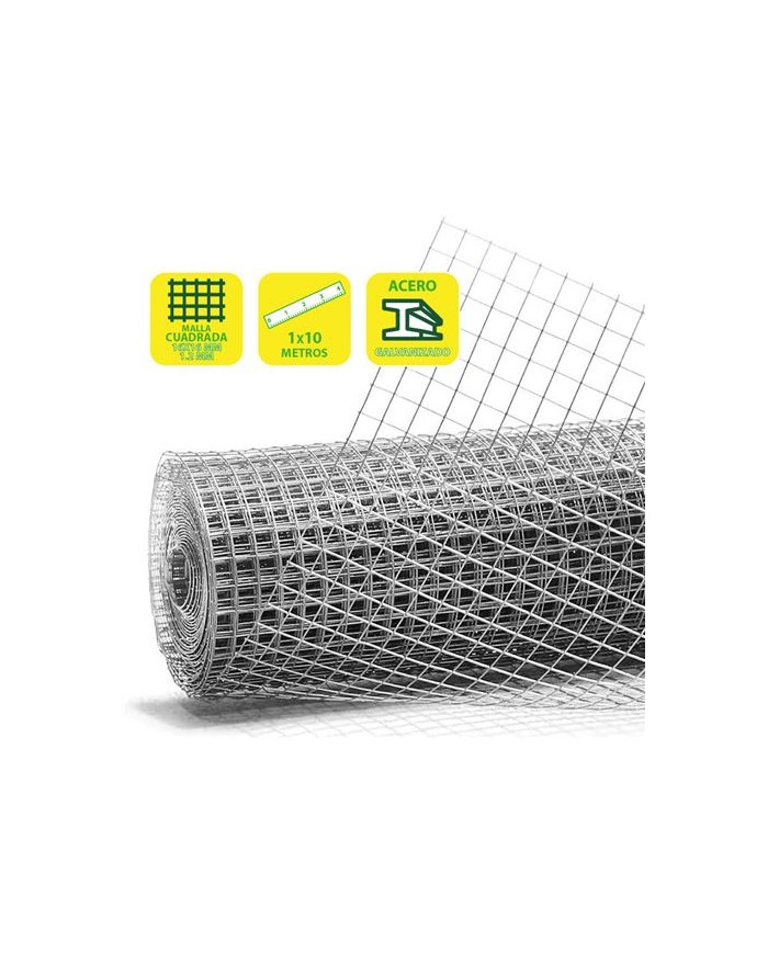 Material: acero galvanizado. til para la proteccin de cultivos, construccin de jaulas y recintos, refuerzos de concreto, industria de la construccin, control de erosin, filtrado y cribado, proyectos de bricolaje y reforzar reas de seguridad. Dimensiones rollo: 1 x 10 metros (alto x largo). Geometra: 16x16mm Dimetro de alambres: 1.2mm. Superficie: 10m2. Se suministra en rollo.