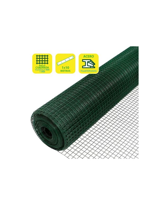 Material: acero plastificado. til para la proteccin de cultivos, construccin de jaulas y recintos, refuerzos de concreto, industria de la construccin, control de erosin, filtrado y cribado, proyectos de bricolaje y reforzar reas de seguridad. Dimensiones rollo: 1 x 10 metros (alto x largo). Geometra: 12.7X12.7mm Dimetro de alambres: 1mm. Superficie: 10m2. Se suministra en rollo.