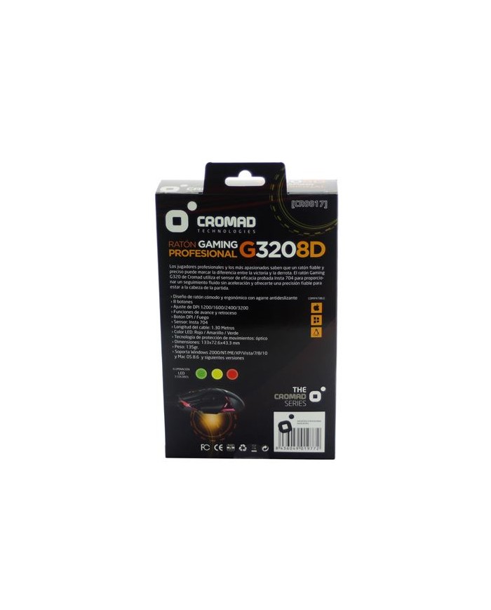 Los jugadores profesionales y los ms apasionados saben que un ratn fiable y preciso puede marcar la diferencia entre la victoria y la derrota. El ratn Gaming G320 de Cromad utiliza el sensor de eficacia probada Insta 704 para proporcionar un seguimiento fluido sin aceleracin y ofrecerte una precisin fiable para estar a la cabeza de la partida.Diseo de ratn cmodo y ergonmico con agarre antideslizante 8 botones Ajuste de DPI 1200/1600/2400/3200 Funciones de avance y retroceso. Botn DPI / Fuego Sensor: Insta 704 Longitud del cable: 1.50 Metros Color LED: Rojo / Amarillo / Verde Tecnologa de proteccin de movimientos: ptico. Dimensiones: 133x72.6x43.3 mm Peso: 135gr Soporta Windows 2000/NT/ME