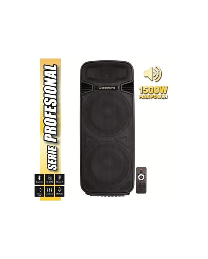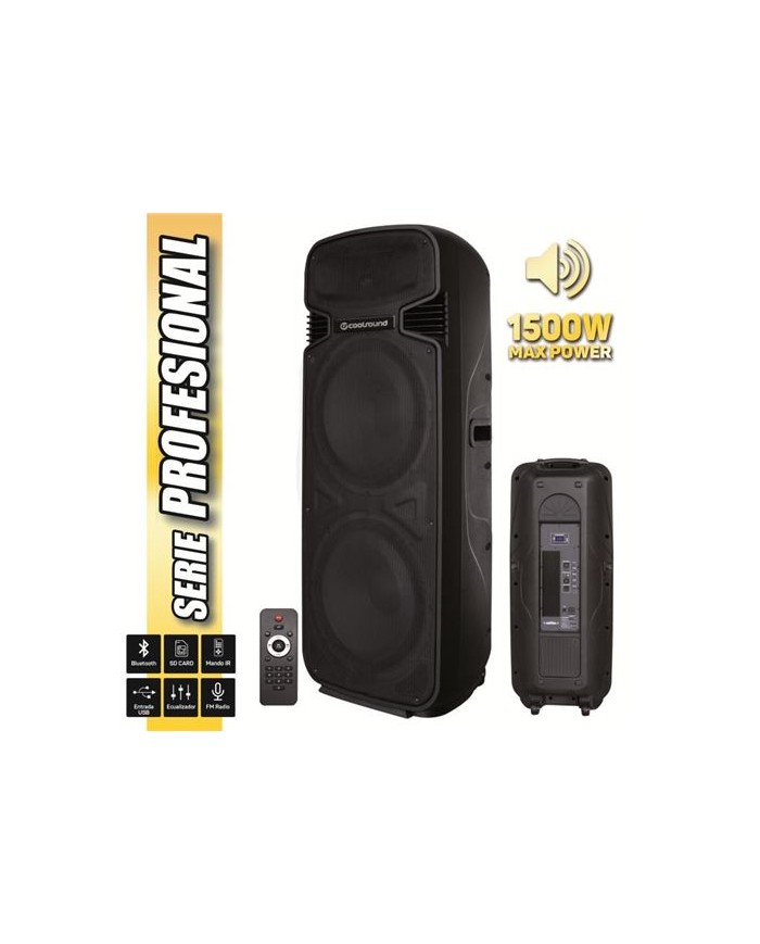 • Altavoz Autoamplificado 2X15" • 450W RMS • Tecnología Bluetooth • Radio FM • Control remoto • Display LCD y botones de control • Control de volumen general • Control de volumen MIC • Control de volumen de entrada de línea. • Ecualizador general • Dimensiones: 459(w.) x 1110(h.) x 380(d.)mm • Peso: 30Kg • Entradas: - USB - Lector de tarjetas SD - 1 x Micrófono entrada Jack 6.3mm - 1 x Micrófono CANON - 1 x Entrada de línea RCA - 1 x Entrada de línea CANON • Salidas: - 1 x Salida CANON • Woofer: 15", 50Oz(156mm), 2"(50mm) KSV • Tweeter: 34mm • Sensibilidad: 97dB(+/-3dB)• Contenido: - 1x Altavoz Autoamplificado - 1x Mando a distancia - 1x Manual en
