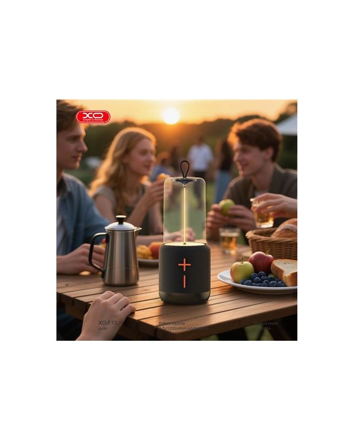 Modelo: XO-F73 Entrada: DC5V / 1A Capacidad de batera: 3.7V / 1200mAh / 4.44Wh (18650) Versin Bluetooth: 5.3 Frecuencia Bluetooth: 2.402GHz 2.480GHz Distancia Bluetooth: Aproximadamente 10m Tiempo de uso: 5h (50% volumen, luz apagada) / 6h (sin audio) Tiempo de carga: Aproximadamente 3h Material: ABS + tela de malla + cordn Color: Negro Tamao del producto: 85נ85נ210mm Peso del producto: 404g aprox. Protocolos soportados: A2DP, AVRCP, HFP, HSP Accesorios: 1 cable de carga Tipo-C de 50cm