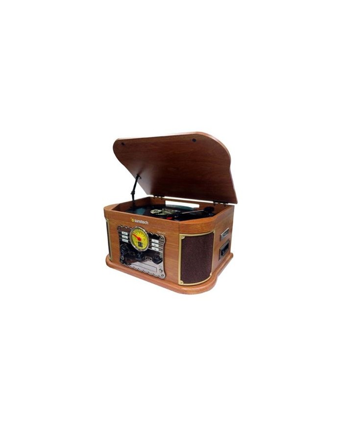 Giradiscos de madera. 3 velocidades: 33, 45 y 78 RPM. Auto-stop: parada automtica (botn On / Off) Bluetooth integrado (compatible con EDR). Reproductor de CD / CD MP3 y pletina para cassette. Funciones: repeticin y programacin. Sintonizador analgico AM / FM estreo. Altavoces estreo: 2.5W RMS x 2 y control de volumen. RCA: salida de audio para amplificadores externos. Puerto USB, lector tarjetas SD / MMC, aux-in y auriculares. Grabacin directa: giradiscos / CD / aux a USB / SD / MMC. Funcin encoding: conversin digital de canciones a MP3.