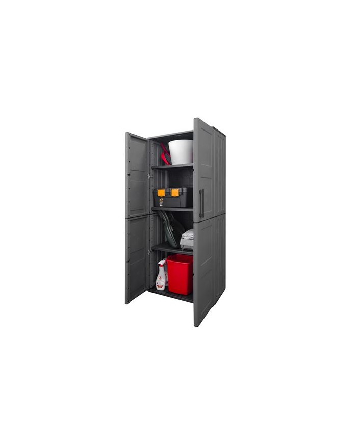Armario de altura completa fabricado en polipropileno reciclable Estantes interiores ajustables para mayor funcionalidad Equipado con bisagras de acero duraderas Ideal para organizar objetos voluminosos o en zonas de almacenamiento vertical Uso recomendado tanto en interior como en exteriores cubiertos Capacidad de carga por estante: 20 kg Medidas: - Ancho: 680 mm - Profundidad: 370 mm - Altura: 1630 mm