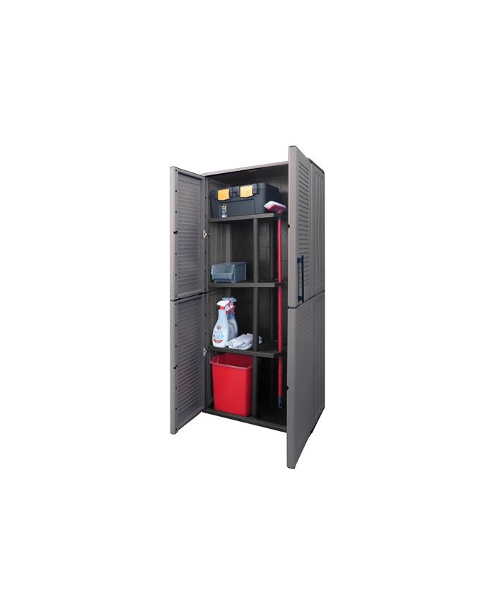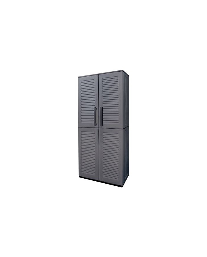 Descripcin: Armario alto de plstico fabricado mediante moldeo por inyeccin Dimensiones: 680 370 1630 mm (ancho x fondo x alto) Color: Gris oscuro Resistente a impactos Alta resistencia a temperaturas extremas, aceites y disolventes Lavable, no absorbe olores ni humedad Peso neto: 13.95 kg Nmero de puertas: 2, con bisagras de acero Estantes interiores: 3 estantes regulables + base Capacidad de carga por estante: 20 kg