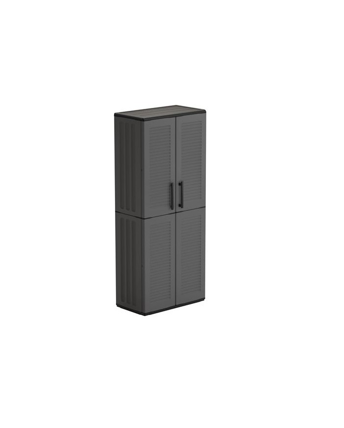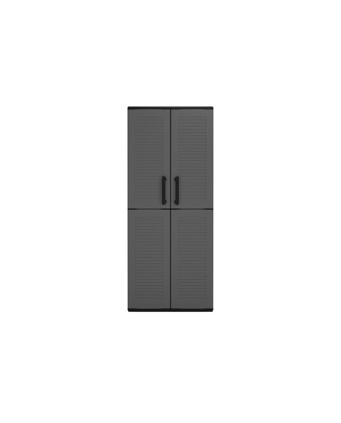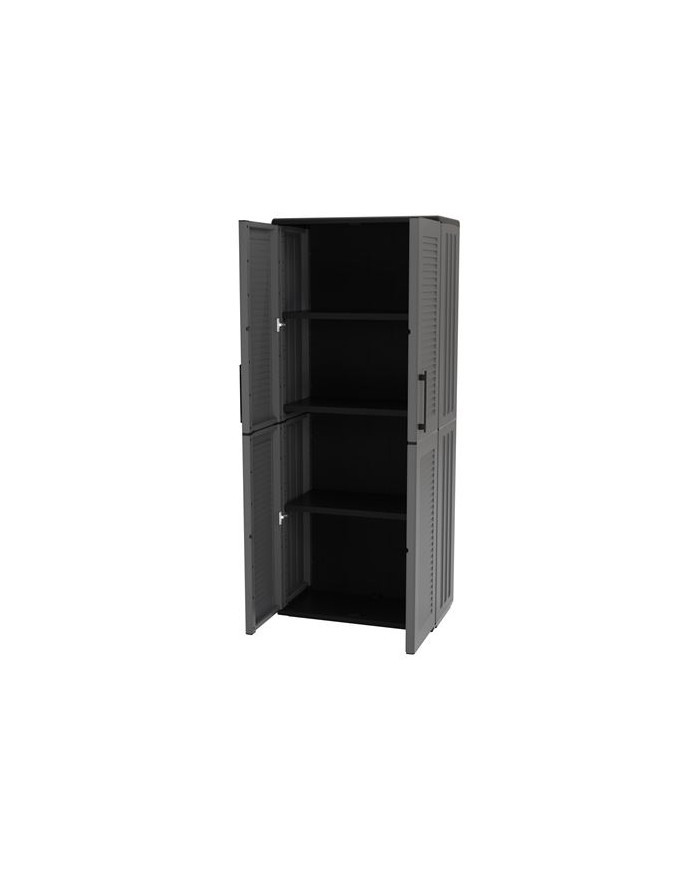 Armario alto de plstico fabricado mediante moldeo por inyeccin Dimensiones: 680 370 1630 mm (ancho x fondo x alto) Color: Gris oscuro Resistente a impactos Alta resistencia a temperaturas extremas, aceites y disolventes Lavable, no absorbe olores ni humedad Peso neto: 14.59 kg Nmero de puertas: 2, con bisagras de acero Estantes interiores: 3 estantes regulables + base Capacidad de carga por estante: 20 kg