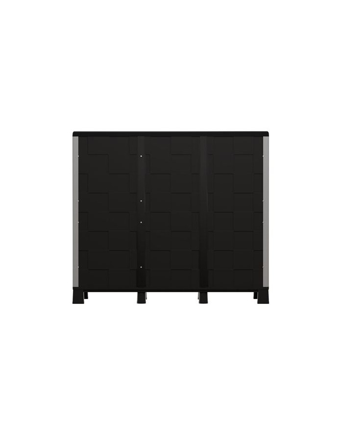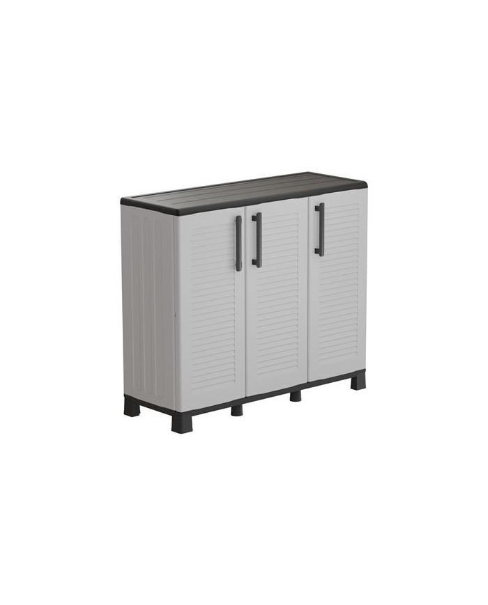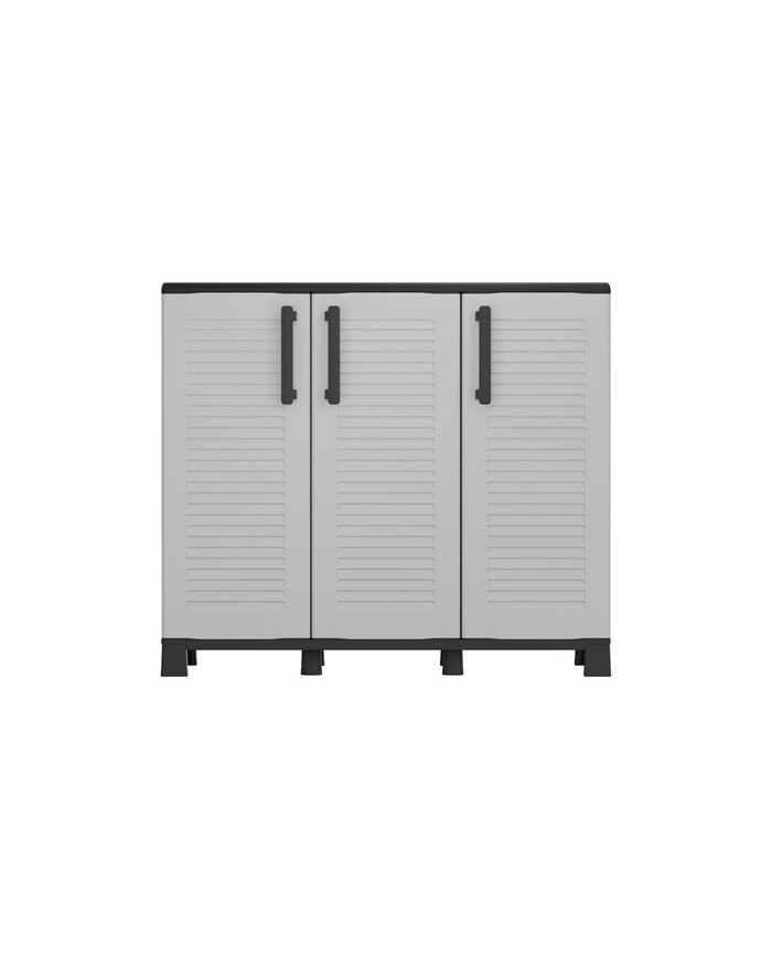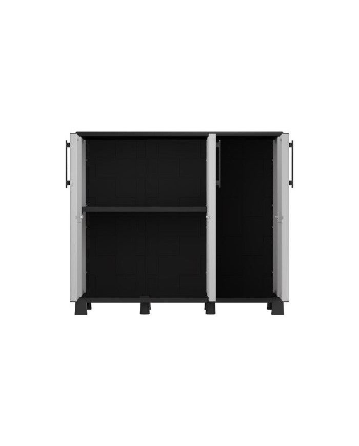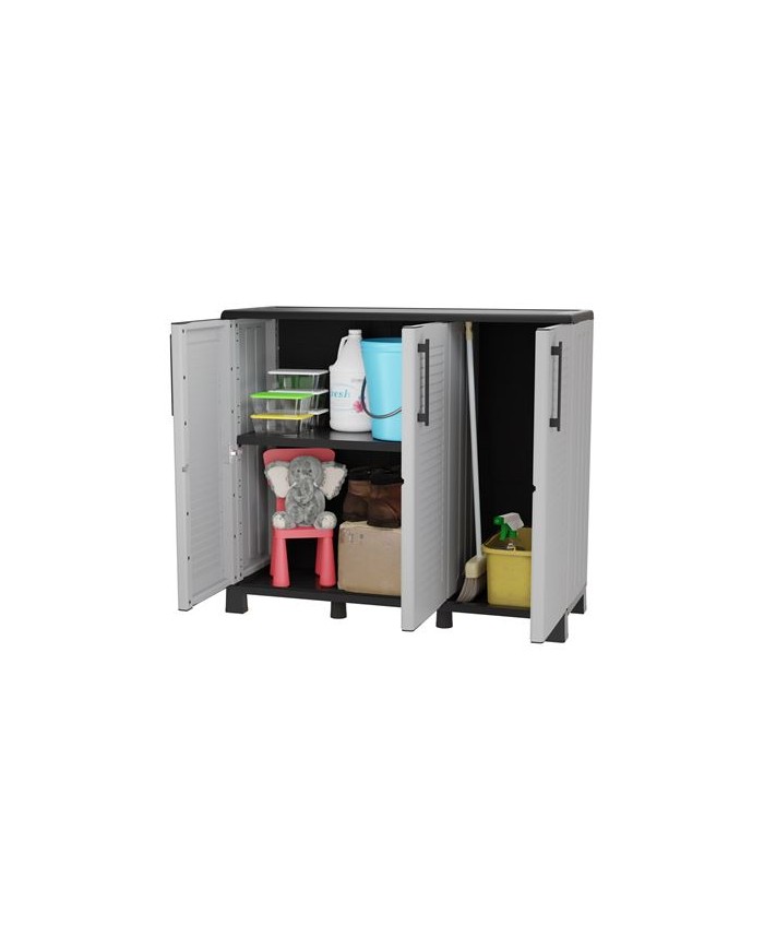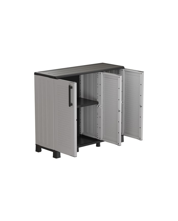 Armario de media altura con ancho extendido Fabricado en polipropileno reciclable y resistente al uso diario Incluye patas regulables y estantes ajustables Equipado con bisagras de acero, perfectas para uso intensivo Ideal para zonas de almacenamiento domstico, cocinas, lavaderos o talleres Capacidad de carga por estante: 20 kg Medidas: - Ancho: 1020 mm - Profundidad: 370 mm - Altura: 900 mm