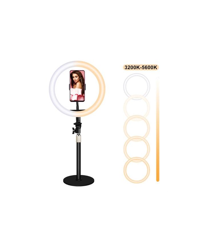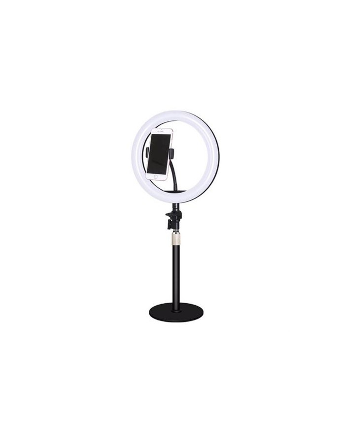 - Pinza para fijacin - Material: aluminio + plstico - Soporte para smartphone apertura hasta 10cm - Lmpara led de 3" con mando para regulacin de luz - 4 niveles de iluminacin por cada seleccin de temperatura de color 3000K - 5000K - Alimentacin USB 5V 50/60Hz
