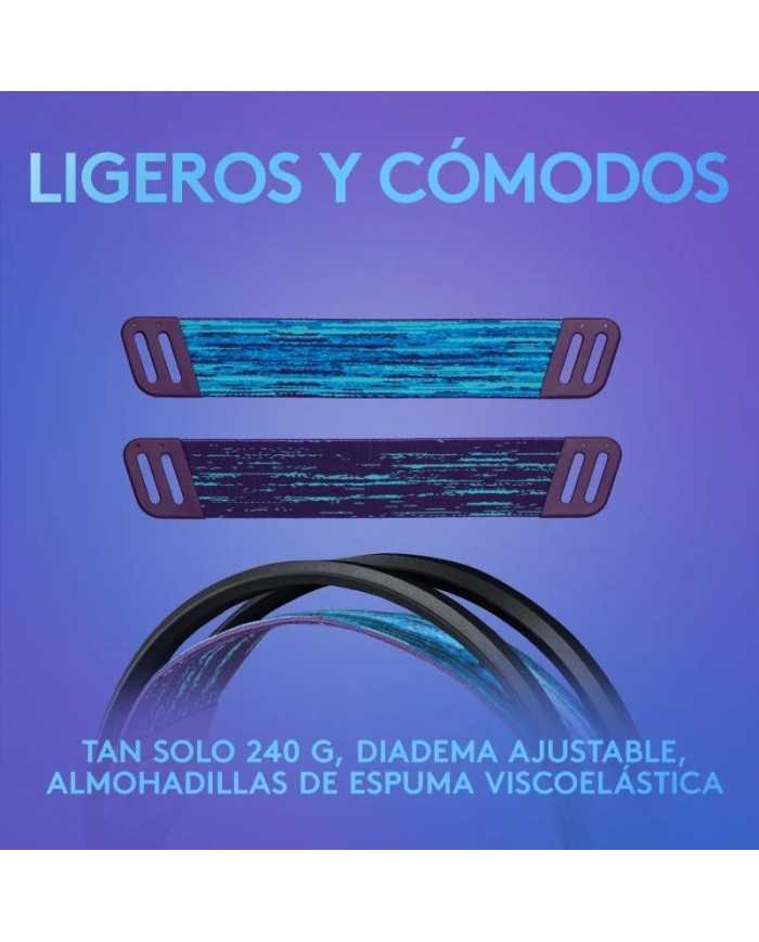 - Diseño Liviano: Con un peso de solo 240 g, el G335 es más pequeño y liviano que el G733, cuenta con una diadema de suspensión para ayudar a distribuir el peso y se adapta para un ajuste personalizado