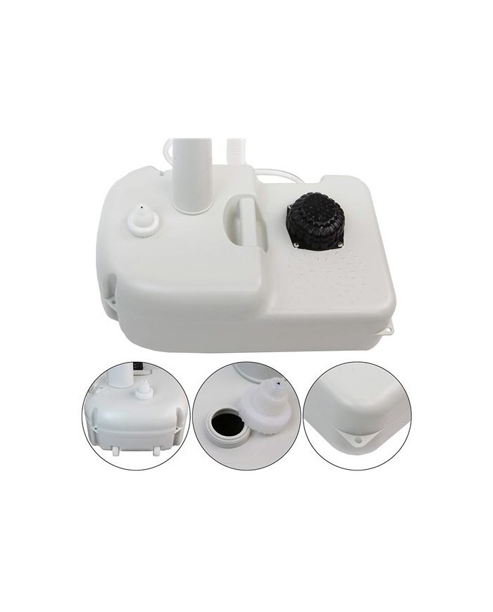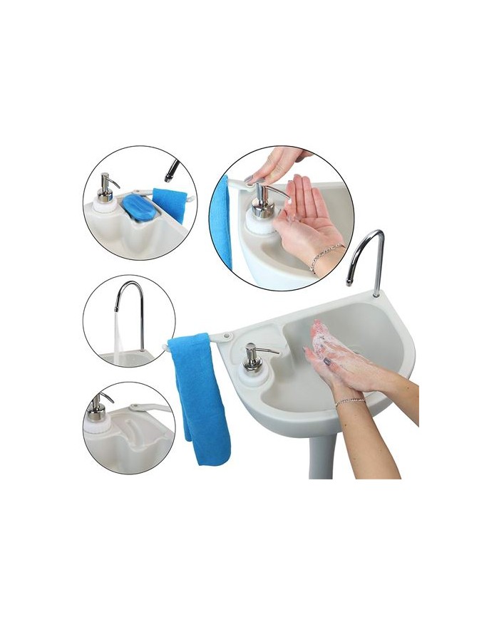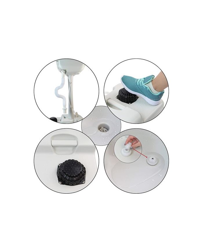 Ideal para acampadas, caravanas, lugares de construccin, etc. Material: polietileno de alta calidad. Diseo de montaje rpido. Capacidad del depsito: 17 litros Capacidad del depsito de jabn de manos: 3 litros Tamao de la manguera de drenaje: 32 hasta 80cm Incorpora colgador para toalla. Bomba de pie con un fuelle de 180ml por pisada Resistente y duradero. Incorpora 2 ruedas y asa para facilitar el transporte. Dimensiones: 810x500x355mm