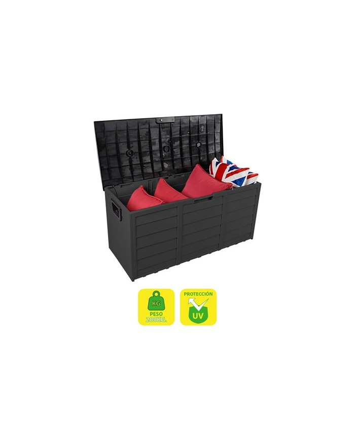 Es un mueble verstil y resistente, ideal para almacenamiento tanto en interiores como en exteriores. Ideal para el almacenamiento en exteriores de cojines y accesorios de jardn, herramientas de jardinera, productos de piscina, resguardar lea o carbn para parrillas, etc. Ideal para el almacenamiento en interiores de juguetes, ropa, zapatos, herramientas, etc. Resistentes al agua y a los rayos UV. Ligeros y fciles de limpiar. Capacidad de carga: 200Kg. Dimensiones: 112x49x54cm Capacidad: 290 litros. Color: gris oscuro.