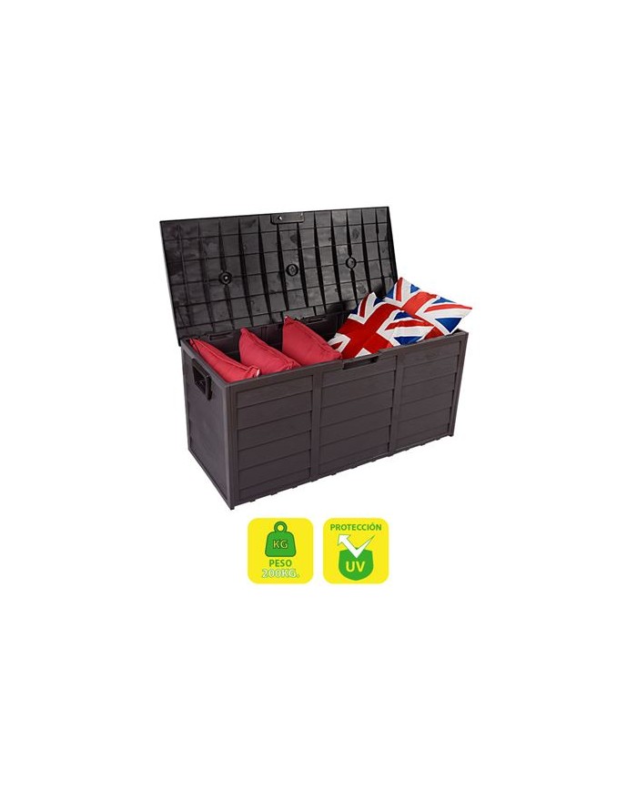 Es un mueble verstil y resistente, ideal para almacenamiento tanto en interiores como en exteriores. Ideal para el almacenamiento en exteriores de cojines y accesorios de jardn, herramientas de jardinera, productos de piscina, resguardar lea o carbn para parrillas, etc. Ideal para el almacenamiento en interiores de juguetes, ropa, zapatos, herramientas, etc. Resistentes al agua y a los rayos UV. Ligeros y fciles de limpiar. Capacidad de carga: 200Kg. Dimensiones: 112x49x54cm Capacidad: 29 litros. Color: marrn.