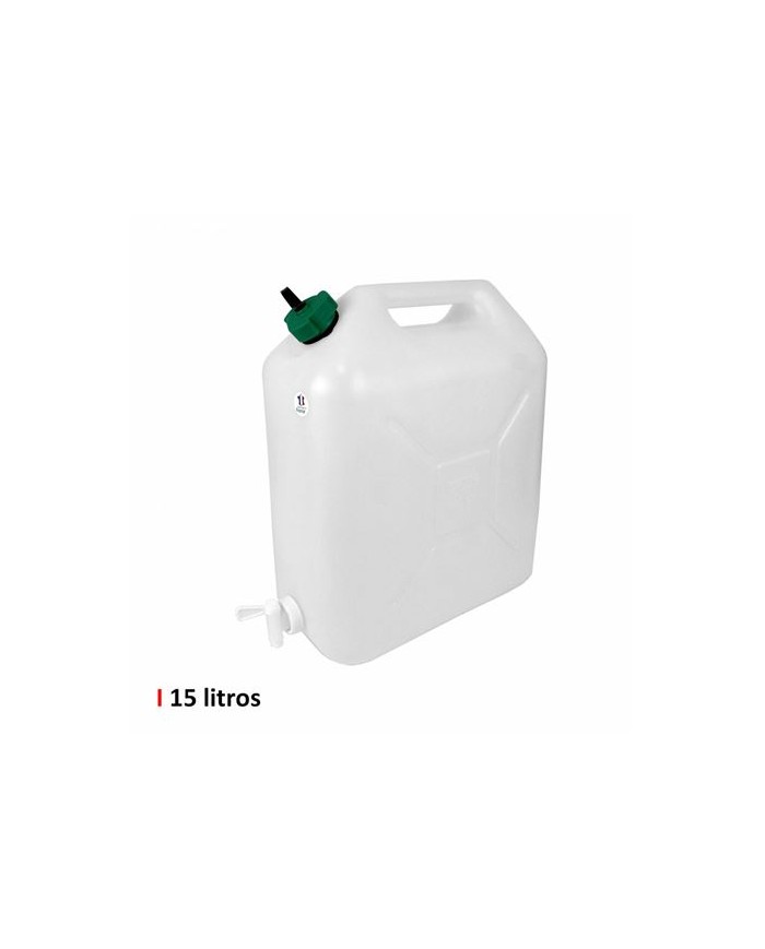 Bidn extra fuerte para almacenar y transportar agua, con tapn a rosca y grifoDispone de asa para transportar fcilmente. - Se llena fcilmente por la parte superior y se extrae el lquido de una forma muy cmoda gracias al grifoMaterial: Polietileno apto para uso alimentario Capacidad: 15 Litros Color: blanco con tapn verde