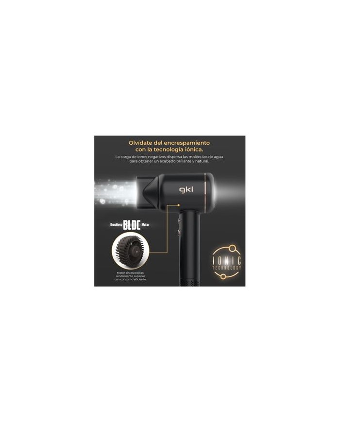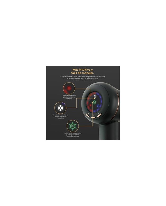 Secador de pelo profesional con motor Brushless Display LED Diseo compacto y optimizado Tecnologa inica 3 niveles de velocidad 4 niveles de temperatura Funcin aire fro Diseo ultraligero Incluye concentrador y difusor