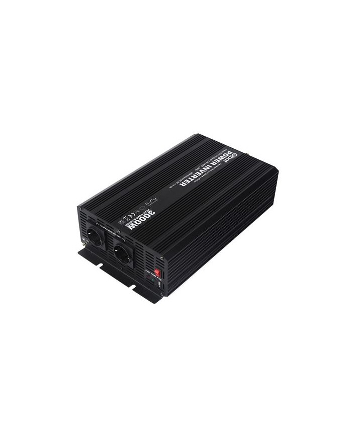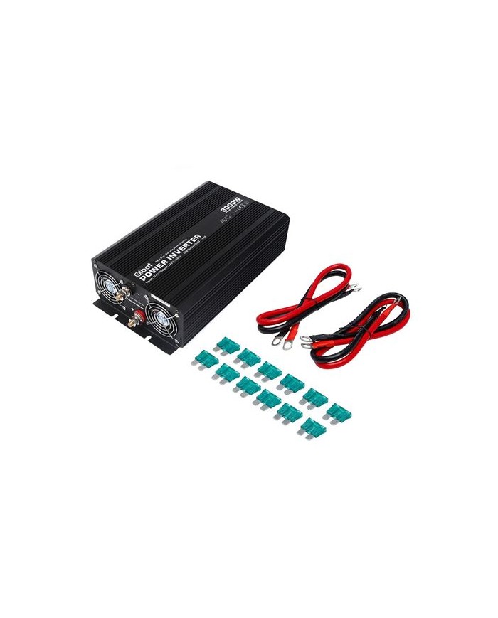 Conversor de corriente 12V - 220V Onda sinusoidal modificada. Potencia continua: 3000W Potencia mxima: 6000W Voltaje de entrada: 12V Voltaje de salida: 220V 50Hz Puerto USB 5V, 2.1A 2 x enchufes schukos Protecciones: - Sobrecalentamiento. - Exceso de carga. - Sobretensin. - Cortocircuito. - Polaridad inversa. - Toma de tierra. - Bajo voltaje batera. Accesorios: - 12 x fusibles 30A - 2 x cables 16mm2, 530mm largo. Dimensiones: 420x230x108mm NOTA: pueden generar armnicos y distorsiones que podran afectar el rendimiento de algunos dispositivos electrnicos. No son ideales para dispositivos sensibles. Para estos dispositivos se recomienda el uso de convertidores de onda pur
