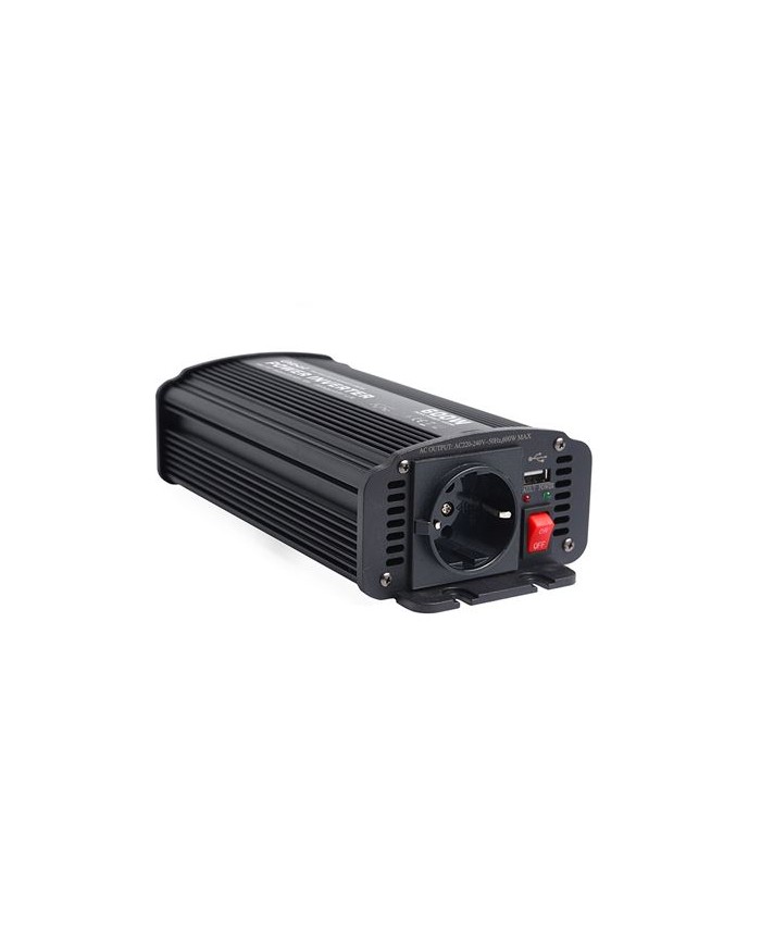 Conversor de corriente 12V - 220V Onda sinusoidal modificada. Potencia continua: 600W Potencia mxima: 1200W Voltaje de entrada: 12V Voltaje de salida: 220V 50Hz Puerto USB 5V, 2.1A 1 x enchufe schuko Protecciones: - Sobrecalentamiento. - Exceso de carga. - Sobretensin. - Cortocircuito. - Polaridad inversa. - Toma de tierra. - Bajo voltaje batera. Accesorios: - 2 x fusibles 40A - Cable 6mm2, 530mm largo. - Cable con enchufe mechero, 600mm largo. Dimensiones: 226x108x62mm NOTA: pueden generar armnicos y distorsiones que podran afectar el rendimiento de algunos dispositivos electrnicos. No son ideales para dispositivos sensibles. Para estos dispositivos se recomienda