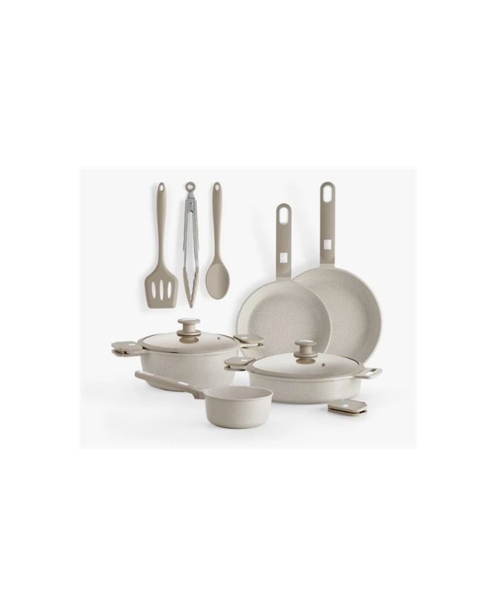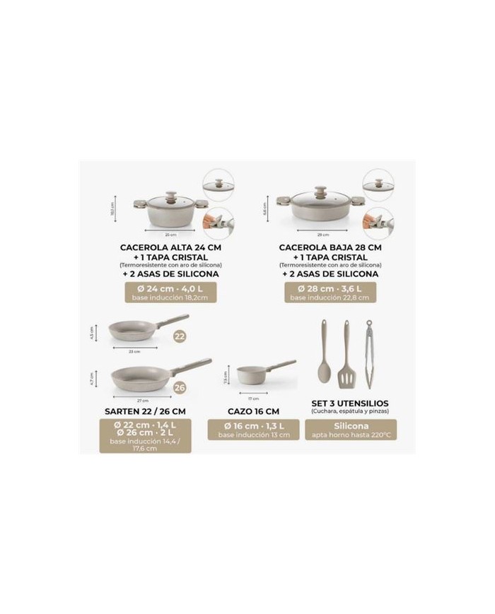 Fabricada en aluminio fundido muy resistente con antiadherente tricapa sin PFOA. Apta para todo tipo de cocinas, gas, induccin, vitrocermica y elctrica gracias a la calidad de los materiales que expanden rpidamente el calor. Incluye asas de silicona desmontables y termorresistentes con efecto pinza para facilitar un correcto y seguro agarre. Las cacerolas son aptas para su uso en horno hasta 220 C, sin tapa y sin asas de silicona. Permiten una gran versatilidad para cocinar, desde bizcochos hasta guisos. Incluye: Cacerola alta 24 cm + 1 tapa 24 cm. Cacerola baja 28 cm + 1 tapa 28 cm. Sartn 22 cm. Sartn 26 cm. Cazo 16 cm. Cuchara de servir. Esptula. Pinzas 2 asas de silicona desmontables.
