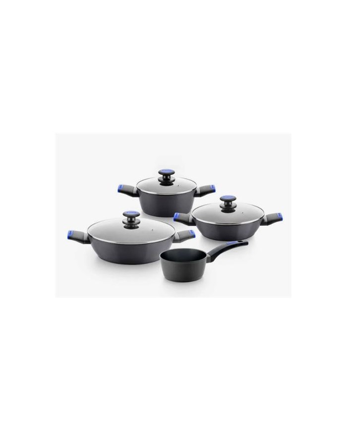 Contiene: cacerola alta de 20 cm con tapa de cristal, cacerola baja de 24 cm con tapa de cristal, cacerola baja de 28 cm con tapa de cristal y cazo de 16 cm. Piezas elaboradas en aluminio forjado 4 mm de espesor. Con antiadherente, sin PFOA. Resistencia y durabilidad de los materiales. Apta para todo tipo de cocinas, incluida la induccin. Fondo de gran espesor para una mayor durabilidad y estabilidad en el cocinado. Tapas de cristal de vidrio templado, termorresistentes con aro de acero y vlvula de despresurizacin. Asas, mango y pomo ergonmicos para un cmodo agarre. Fondo difusor: Cacerola alta 20 cm (13 cm fondo inductor), cacerola baja 24 cm (16 cm fondo difusor), cacerola 28 cm (19 cm fondo inductor), cazo 16 cm (12 cm