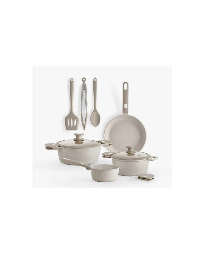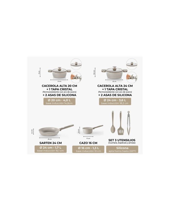 Fabricada en aluminio fundido muy resistente con antiadherente tricapa sin PFOA. Apta para todo tipo de cocinas, gas, induccin, vitrocermica y elctrica gracias a la calidad de los materiales que expanden rpidamente el calor. Incluye asas de silicona desmontables y termorresistentes con efecto pinza para facilitar un correcto y seguro agarre. Las cacerolas son aptas para su uso en horno hasta 220 C, sin tapa y sin asas de silicona. Permiten una gran versatilidad para cocinar, desde bizcochos hasta guisos. Incluye: Cacerola alta 24 cm + 1 tapa 24 cm. Cacerola alta 20 cm + 1 tapa de 20 cm Sartn 24 cm. Cazo 16 cm. Cuchara de servir. Esptula. Pinzas