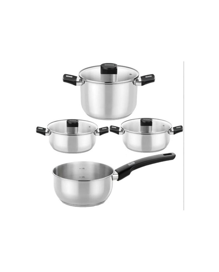 Batera fabricada en acero inoxidable 18/0. Triple fondo difusor que asegura un eficiente reparto del calor. Apta para todo tipo de cocinas, incluidas las de induccin. Apta para lavavajillas. Terminacin del cuerpo en acero pulido brillante. Mangos y asas fabricadas en acero inoxidable con acabado pulido brillante. Tapa: Vidrio templado y acero inoxidable con acabado pulido brillante. LA BATERIA DE COCINA INCLUYE Cacerola de 20 cm Tapa de vidrio de 20 cm Cacerola de 24 cm Tapa de vidrio de 24 cm Olla de 20 cm Tapa de vidrio de 20 cm Olla de 24 cm Tapa de vidrio de 24 cm Cazo de 16 cm