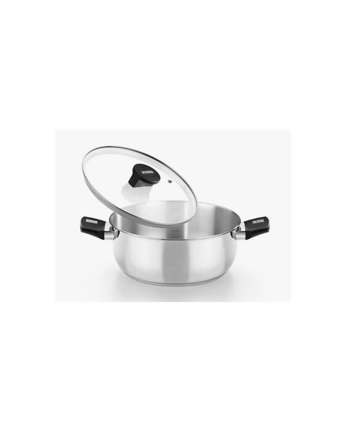 Fabricado en acero inoxidable 18/10. Fondo difusor de aluminio de 4,5mm. Espesor total del fondo de 5,7mm. Asas de baquelita termoestable color negro de nuevo diseo. Tapa de cristal de 4mm de espesor templada. Pomo de baquelita termoestable de diseo actual. Compatible con todas las fuentes de calor, incluida induccin.