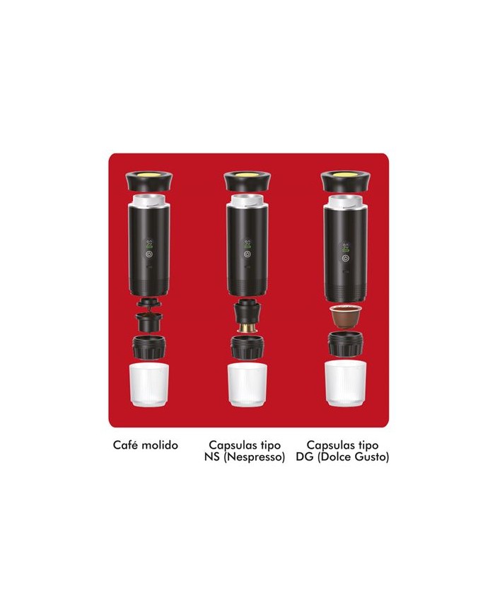 Disfruta del caf perfecto ests donde ests. Esta cafetera porttil 3 en 1 est diseada para acompaarte en tus aventuras, viajes o simplemente para darte un buen caf en la oficina o en casa, sin cables ni complicaciones... Compatibilidad total: - Compatible con caf molido, cpsulas tipo DG (Dolce Gusto) y NS (Nespresso). - Elige tu estilo, sabor y forma favorita de preparar caf. Modo caliente / Modo fro: - Extraccin en caliente: lista en 5-6 minutos, con una presin profesional de 20 bares. - Cold brew: perfecto para caf fro en das calurosos o para los ms modernos. Potencia y autonoma: - Batera recargable de 7500mAh (3 x 2500mAh) para preparar hasta: * 4-5 cafs con 50 ml de agua * 3-4 cafs con 80 ml de agua * M
