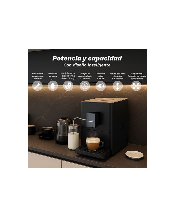 20Bar de presion Deposito de agua 1.2 litros Capacidad grano 130gr Pantalla tactil Molinillo desmontable Medida 18x42x33