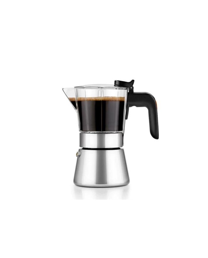 Cuerpo que combina dos materiales de fabricacin: acero inoxidable y vidrio de borosilicato. Cuerpo inferior de acero inoxidable ferrtico de 1,5 mm, de alta calidad y muy resistente al desgaste. Parte superior de vidrio de borosilicato de 2,5 a 3 mm de espesor. Vidrio de gran transparencia y resistencia al calor. Fondo difusor full induction apto para todo tipo de cocinas. En cocinas de induccin consigue la mxima eficiencia en la conductividad de las placas, gracias a su construccin en acero inoxidable ferrtico. Pomo y asa de baquelita, aislante de del calor. Acabado brillante. En induccin, utilizar con una placa de dimetro adecuado al de la base de la cafetera.