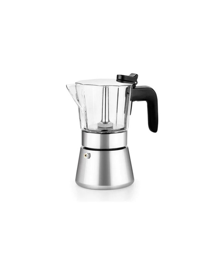 Cuerpo que combina dos materiales de fabricacin: acero inoxidable y vidrio de borosilicato. Cuerpo inferior de acero inoxidable ferrtico de 1,5 mm, de alta calidad y muy resistente al desgaste. Parte superior de vidrio de borosilicato de 2,5 a 3 mm de espesor. Vidrio de gran transparencia y resistencia al calor. Fondo difusor full induction apto para todo tipo de cocinas. En cocinas de induccin consigue la mxima eficiencia en la conductividad de las placas, gracias a su construccin en acero inoxidable ferrtico. Pomo y asa de baquelita, aislante de del calor. Acabado brillante. En induccin, utilizar con una placa de dimetro adecuado al de la base de la cafetera.