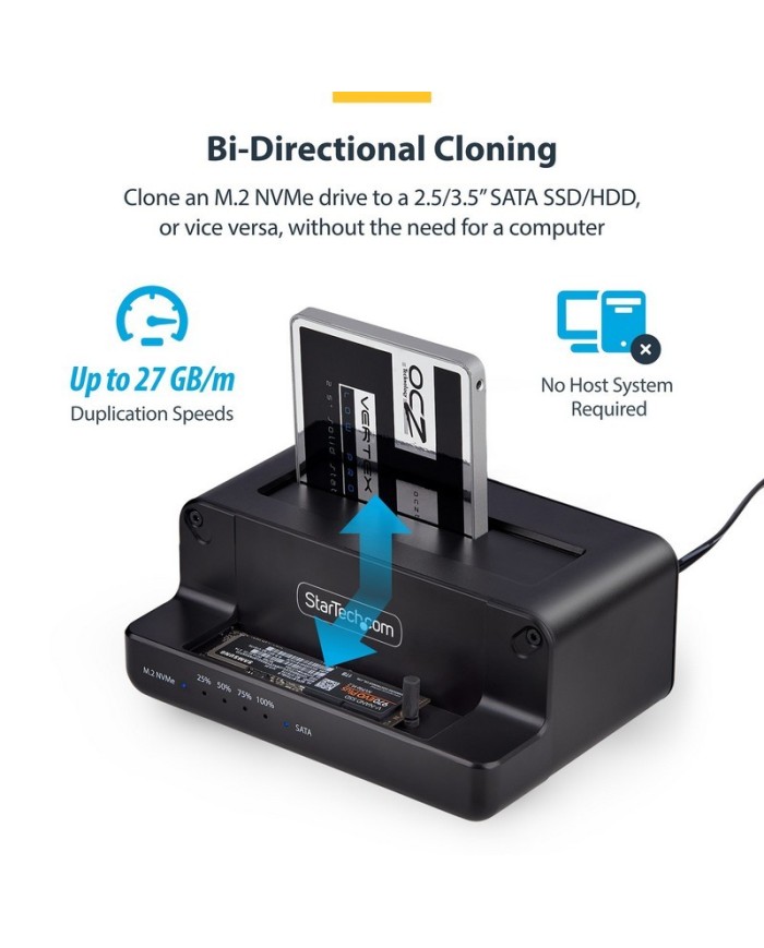 El StarTech.com N2-M2-SSD-DUPLICATOR es un duplicador autónomo bidireccional que permite clonar unidades M.2 NVMe a SSD/HDD SATA de 2,5" o 3,5" y viceversa, sin necesidad de computadora. Ideal para profesionales de IT, soporte técnico y despliegues masivos.