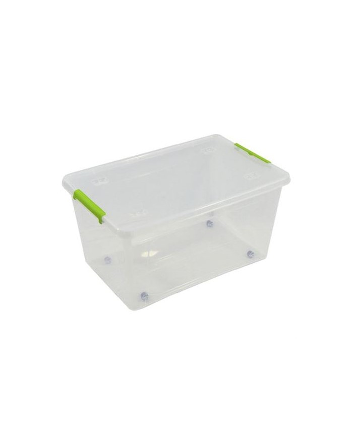 Caja transparente con tapa para almacenamiento de gran capacidad Incluye ruedas integradas para transporte fcil incluso con peso Sistema de ganchos de cierre seguro en ambos laterales Ideal para guardar ropa de temporada, mantas, juguetes grandes, materiales de oficina, etc. Apilable, resistente y muy til en hogares, trasteros, oficinas o mudanzas Medidas: - Largo: 585 mm - Ancho: 390 mm - Altura: 300 mm