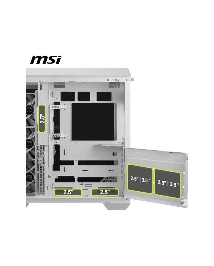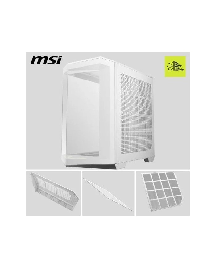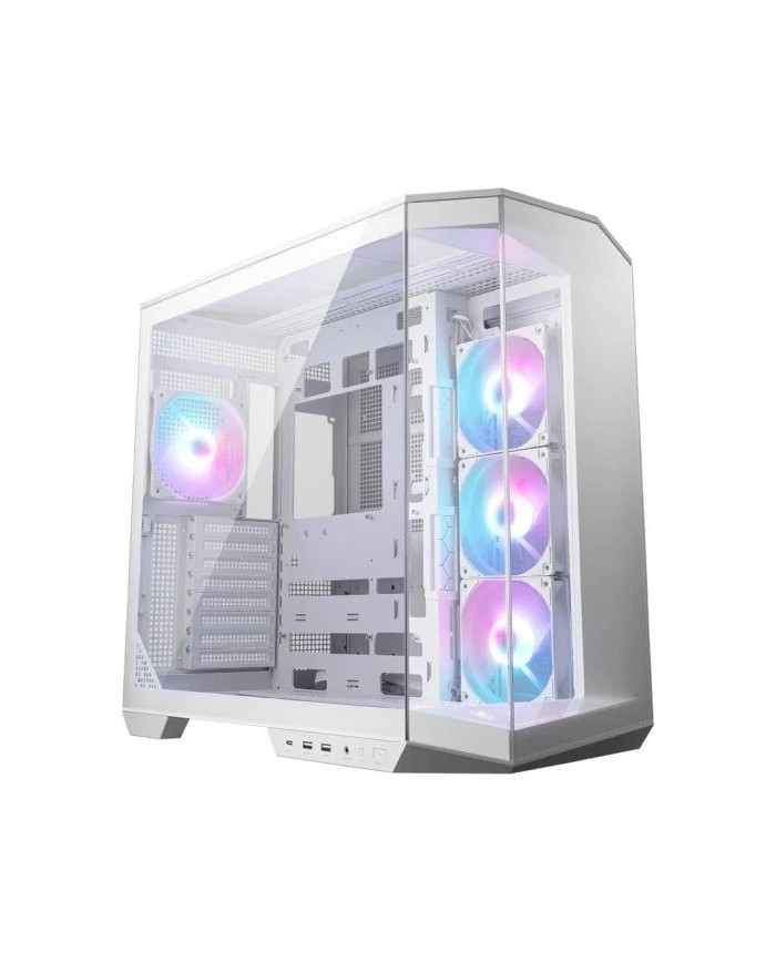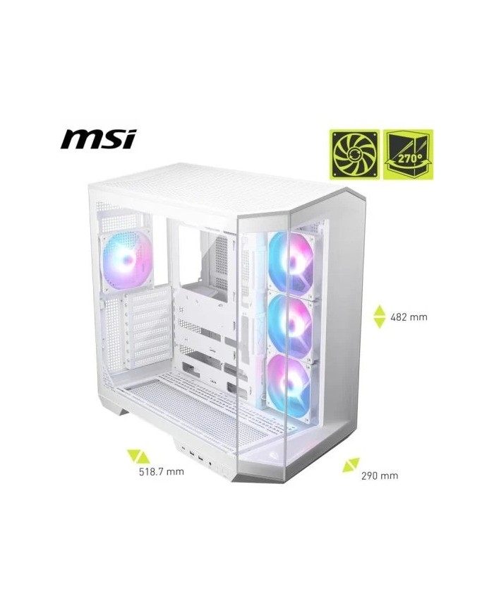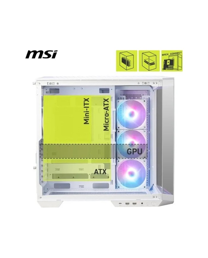 El MAG PANO 100R PZ WHITE viene con un panel de vidrio templado de 270 grados y es compatible con dos tamaños diferentes de placas base Back-connect, lo que aumenta la limpieza de la construcción de su PC mientras mejora su estética y organización general. MAG PANO 100R PZ WHITE ofrece una espectacular iluminación ambiental con 3 ventiladores de admisión ARGB PWM de hoja inversa de 120 mm y 1 ventilador de escape ARGB PWM de 120 mm preinstalado. Esta funda de PC ofrece un soporte de instalación vertical para tarjetas gráficas.