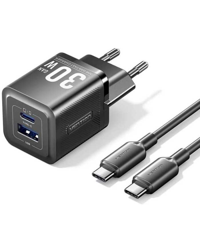CARGADOR DE PARED VENTION GAN USB-C + USB-A 30W BLACK + CABLE UCB-C 1M BLACK