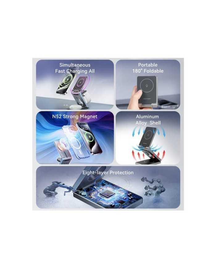 Carga simultánea: Permite cargar tres dispositivos al mismo tiempo: iPhone, Apple Watch y AirPods.