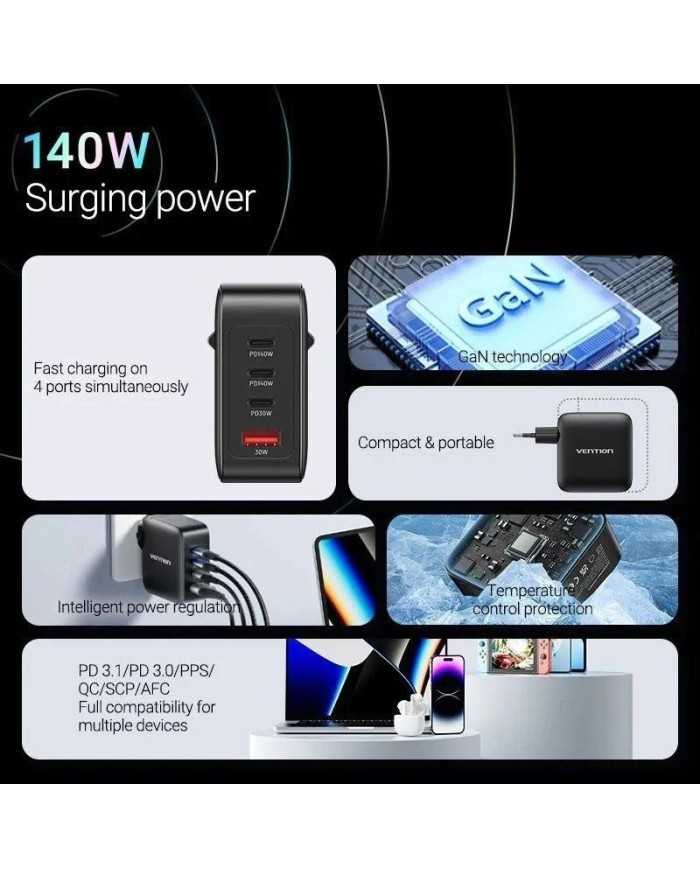 - El kit de carga GaN de 4 puertos Vention está equipado con tres puertos USB-C y un puerto USB-A