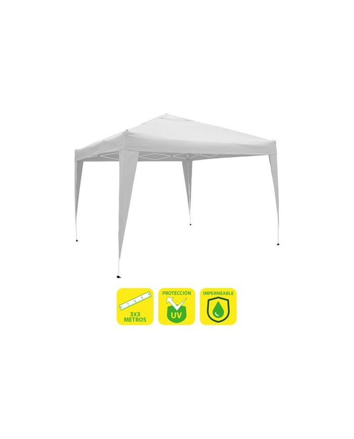 Ofrece una sombra de calidad, manteniendo una temperatura agradable y protegiendo de los rayos UV. Las propiedades impermeables de la cubierta se adaptan perfectamente a los climas cambiantes. Sol y lluvia dejarn de preocuparte! Gracias a su ingenioso diseo, esta carpa se pliega de manera rpida y sencilla en un instante. Disfruta de la comodidad de transportarla y almacenarla sin complicaciones, ideal para facilitar la preparacin y organizacin en cualquier evento o salida al aire libre Con medidas de 3 metros de longitud por 3 metros de anchura y una altura de techo de 2,5m, proporciona un ambiente perfecto disfrutar de reuniones al aire libre con espacio suficiente para 8 personas alrededor de una mesa Incluye un set completo de piquetas y vientos, lo