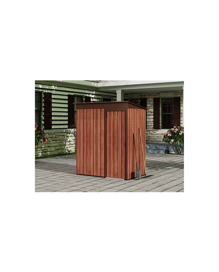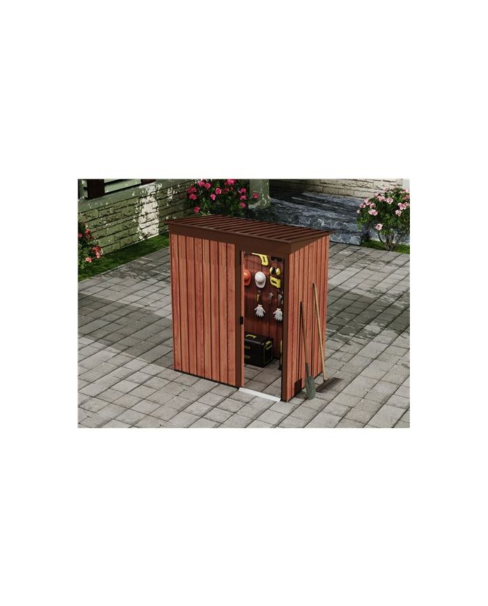 tiles para quienes necesitan un espacio adicional seguro y resistente para almacenar objetos. Dimensiones: 91x151x182cm, 1.37m2 (largo x ancho x alto) Color: efecto madera. Paneles de acero galvanizado de 0.25mm de espesor. Techo inclinado para facilitar la salida de agua. Puerta de corredera. Marco de aluminio y base de metal. Fcil montaje y mantenimiento. Peso: 38kg Ancho puerta: 50cm Esto producto se suministra en 1 bulto: - 172x61.5x9.5cm - 35.20Kg