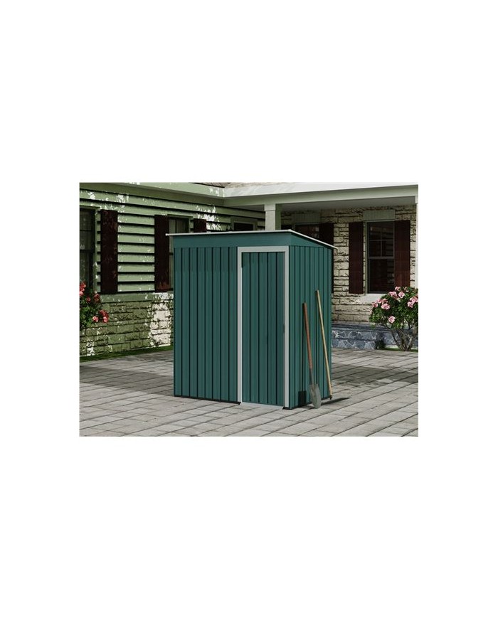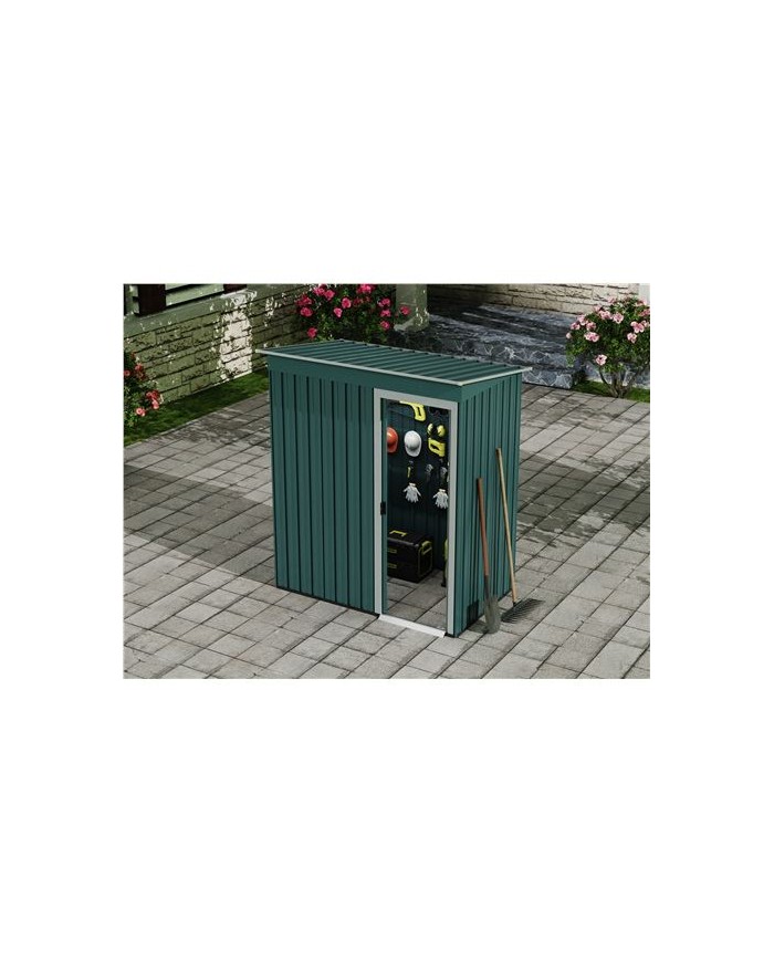tiles para quienes necesitan un espacio adicional seguro y resistente para almacenar objetos. Dimensiones: 91x151x182cm, 1.37m2 (largo x ancho x alto) Color: verde. Paneles de acero galvanizado de 0.25mm de espesor. Techo inclinado para facilitar la salida de agua. Puerta de corredera. Marco de aluminio y base de metal. Fcil montaje y mantenimiento. Peso: 38kg Ancho puerta: 50cm Esto producto se suministra en 1 bulto: - 172x61.5x9.5cm - 35.20Kg