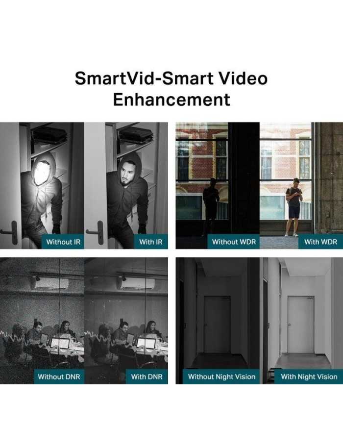 - Mejora inteligente de video SmartVid. Las diferentes tecnologas integradas en la Cámara de videovigilancia VIGI, como Smart IR, WDR (Wide Dynamic Range), 3D DNR y Night Vision, procesan los videos para mejorar su calidad y facilitar su posterior visualizacin. _x000D_
