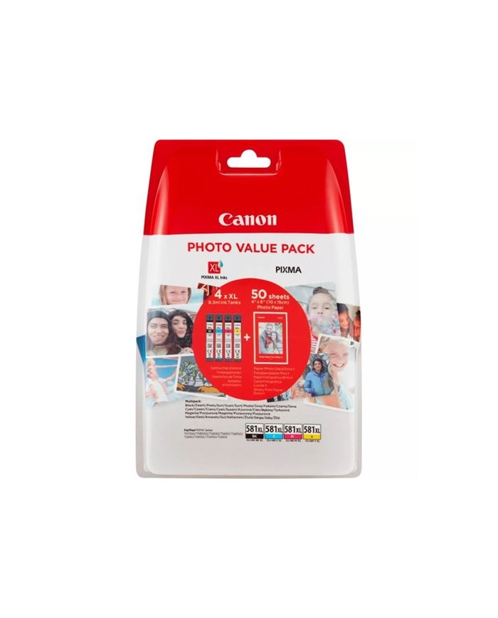 Cartucho de tinta CLI-581XL BK/C/M/Y de Canon + Pack econmico de papel fotogrfico.Este multipack de alto rendimiento de tintas negras, cian, magenta y amarilla + pack de papel fotogrfico se usa para imprimir documentos y fotos de alta calidad. Los cartuchos tienen una mayor capacidad, lo que se traduce en un mejor valor y hasta el doble de impresiones en comparacin con los equivalentes estndar. Si se combina con el Papel fotogrfico brillo II de Canon, protege las imgenes contra la prdida de color gracias a los depsitos de tinta con sistema ChromaLife100 de 8,3 ml. Imprime al siguiente rendimiento de impresin con las tintas de color XL para foto: 199 fotos con la amarilla XL, 225 fotos con la magenta XL, 520 fotos con la negra XL y 170 fotos con la cian XL en