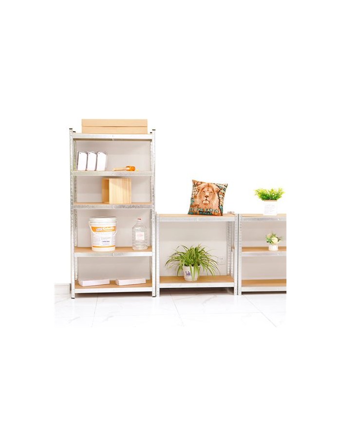 Estantera galvanizada 5 baldas ajustables Soporte 250Kg por balda. Dimensiones: 180X120X45cm Estanteria rectangular sin tornillos Espesor acero galvanizado: 0.9mm Espesor estantes de madera MDF: 5mm