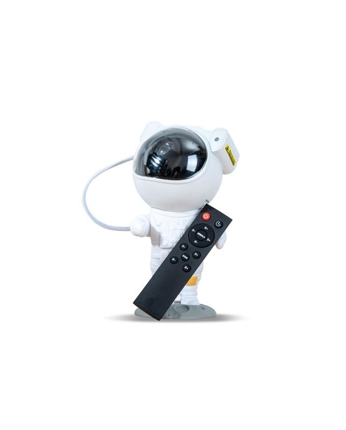 Este pequeo proyector con diseo de astronauta cambia la atmsfera y trae la galaxia a tu habitacin. Incluye varios modos de luces de nebulosa y modos de estrellas. Ajustable en ngulo y rotacin 360 Control remoto para seleccionar entre mltiples modos de luz y controlar la velocidad y brillo. Botonera trasera para control de modos Dimensiones: 210x110mm Potencia: 5W Longitud de onda lser: 532nm Alimentacin USB 5V / 1Amp