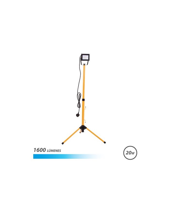 Potencia: 20W | 1.600 Lumens Soporte de alta calidad completamente regulable en altura hasta 1.4 metros Cable de 3 metros de longitud 6.500K Luz Fria. 30.000 - 50.000 horas de vida. Angulo 120 Proteccin: IP65 para usar en exterior.