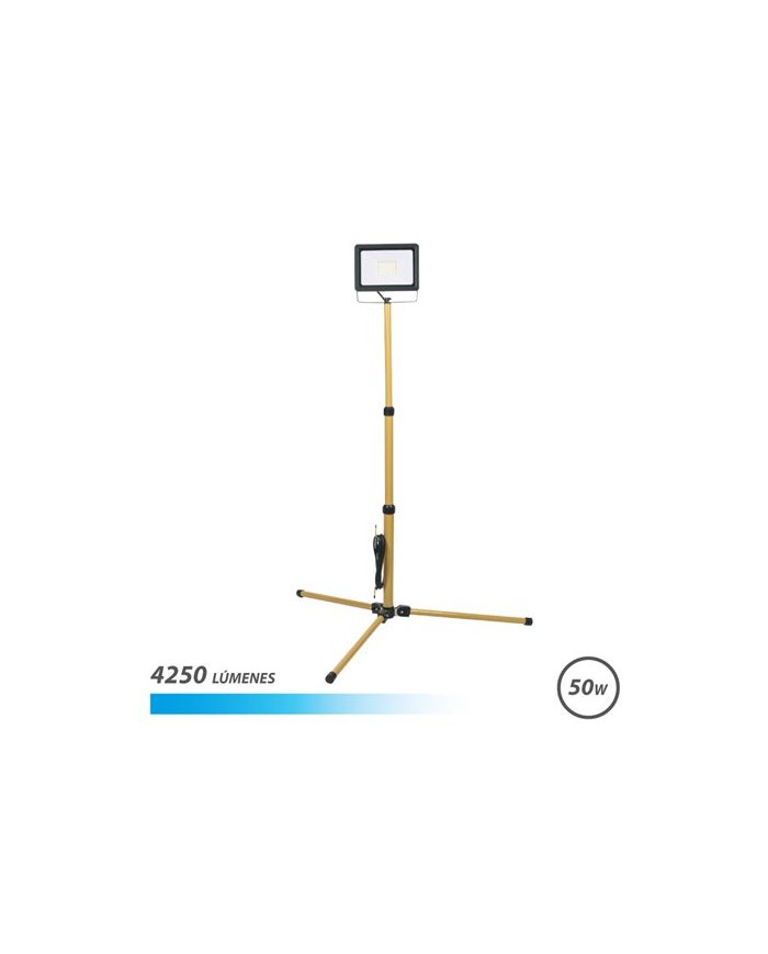 Potencia: 50W | 4.250 Lumens Soporte de alta calidad completamente regulable en altura hasta 1.6 metros Cable de 3 metros de longitud 6.500K Luz Fria. 30.000 - 50.000 horas de vida. Angulo 120 Proteccin: IP65 para usar en exterior.