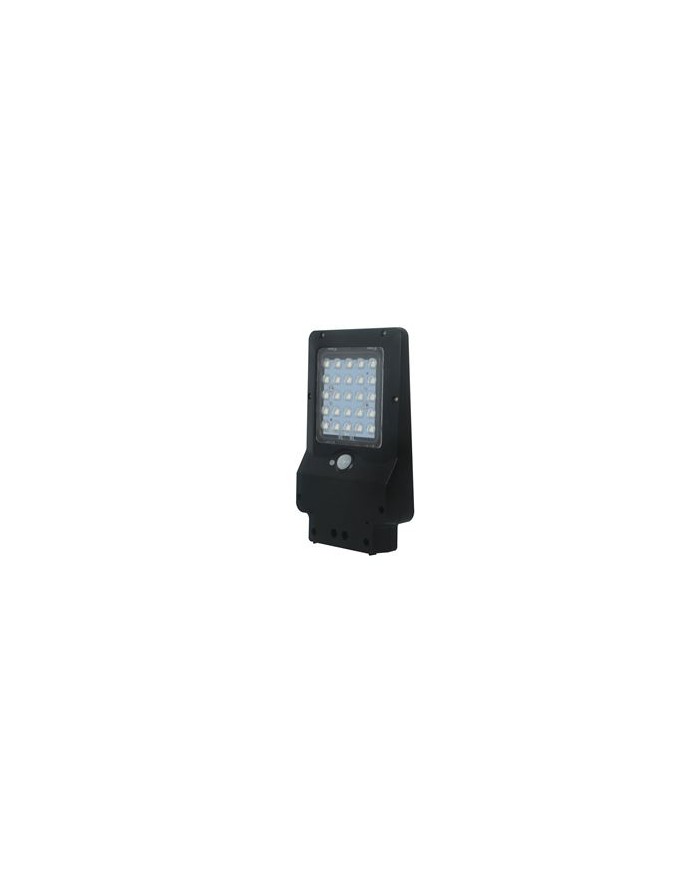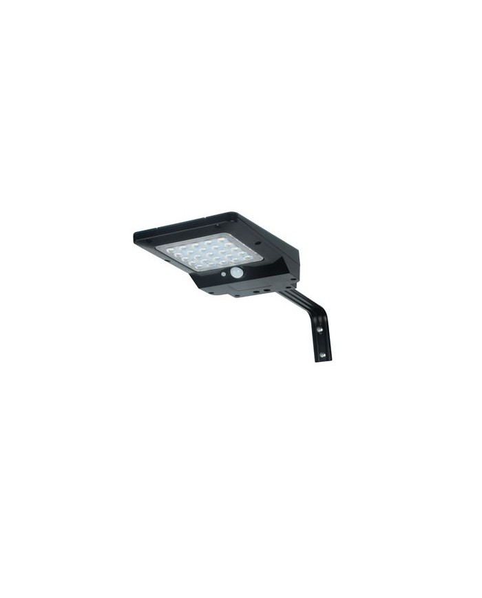 400 Lmenes Luz fria: 6000K Sensor de movimiento Angulo de deteccin: 120 hasta 6 metros Batera: 3.7V, 2400mAh Panel Solar 2.3W IP65 ngulo: 140 Incluye soporte en L Instalacin en pared o poste Altura de instalacin recomendada 2 - 3 metros. Botn de encendido / apagado Modo de trabajo - Durante las primeras 5 horas de trabajo si detecta movimiento en un rango de 6 metros se enciende al 100% (400lumens). Una vez pasados 20 segundos sin deteccin de movimiento baja la potencia de la luz y se queda fija - Despues de 5 horas de funcionamiento o cuando el nivel de batera es inferior al 30%, si detecta movimiento en un rango de 6 metros se enciende al 100% (400lumens). Una vez pasados 20 segundos s