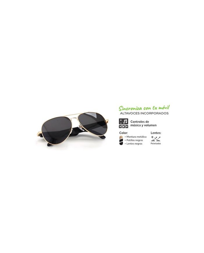 Diseo elegante y sofisticado, con estructura metlica y acabados premium. Conectividad Bluetooth, permite sincronizar fcilmente con tu mvil. Altavoces integrados en las patillas para escuchar msica o atender llamadas. Micrfono incorporado para llamadas con manos libres. Controles tctiles para ajustar volumen, cambiar canciones o responder llamadas. Lentes polarizadas con proteccin UV400 contra rayos ultravioleta. Montura metlica resistente y patillas negras ligeras y cmodas. Batera recargable con autonoma ideal para uso diario. Carga mediante cable USB. Alcance Bluetooth: hasta 10 metros. Duracin de batera: 34 horas de reproduccin continua. Tiempo de carga: 12 horas. Compatibilidad: Android