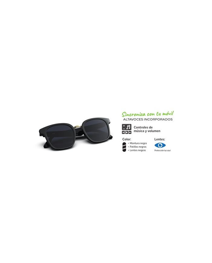 Diseo moderno y minimalista, con montura negra de acabado elegante. Altavoces integrados en las patillas, ideales para escuchar msica o atender llamadas sin auriculares. Conectividad Bluetooth, permite sincronizar fcilmente con tu mvil. Micrfono incorporado para llamadas manos libres con buena calidad de audio. Controles integrados para volumen, reproduccin y llamadas. Lentes polarizadas con proteccin UV400 contra los rayos ultravioleta. Montura ligera y resistente, cmoda para uso prolongado. Batera recargable de larga duracin con carga por cable USB. Calidad de sonido estable y clara, con tecnologa Audio-X. Alcance Bluetooth: hasta 10 metros. Duracin de batera: 34 horas de reproduccin. Tiempo de