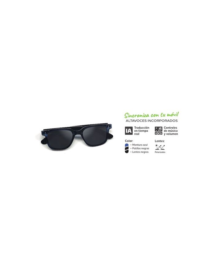 Diseo moderno y resistente, con montura azul y patillas negras. Patillas con muelle metlico flexible, que brindan un ajuste cmodo y duradero. Altavoces integrados con conexin Bluetooth para sincronizar con tu mvil fcilmente. Micrfono incorporado para atender llamadas manos libres con claridad. Controles de msica y volumen integrados en las patillas. Lentes polarizadas con proteccin UV400 contra rayos ultravioleta. Material ligero, ideal para uso prolongado y actividades al aire libre. Batera recargable, con autonoma ideal para varias horas de reproduccin. Carga mediante cable USB. Alcance Bluetooth: hasta 10 metros. Duracin de batera: 34 horas de reproduccin continua. Tiempo de carga: 12 horas.<