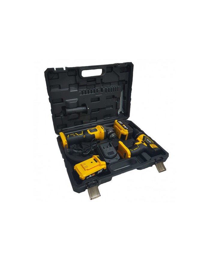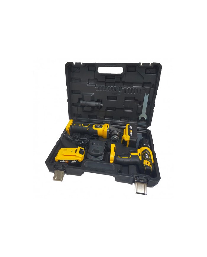 Pack compuesto de taladro + radial Incluye 2 bateras 20V. 1 x 2.0Ah, 1 x 4.0 Ah Cargador rpido. BL0492 Incluye maletn de transporte.ESPECIFICACIONES TALADRO: Taladro con funciones de impacto. Capacidad de perforacin: 13mm (metal) / 13mm (hormign) / 25mm (madera) Mango ergonmico Display y luz LED para iluminar la zona de trabajo. 2 velocidades: 0-400rpm y 0-1500rpm Par mximo: 32Nm. Par de apriete: 20+3 Portabrocas de 10mm sin llaveESPECIFICACIONES RADIAL: Velocidad sin carga: 8500 rpm Dimetro del disco: 115/125 mm Max. Espesor de disco: 6 mm Soft Start incluido Agarre ergonmico suave. Funcin anti-reinicio. 1 x protector de disco 1