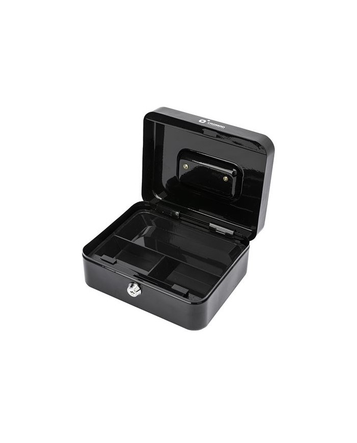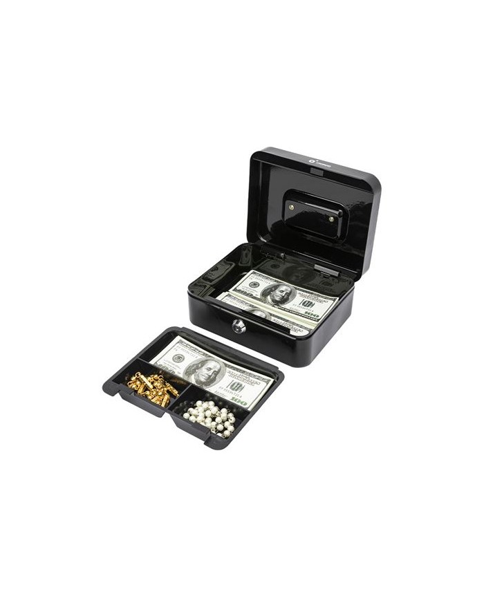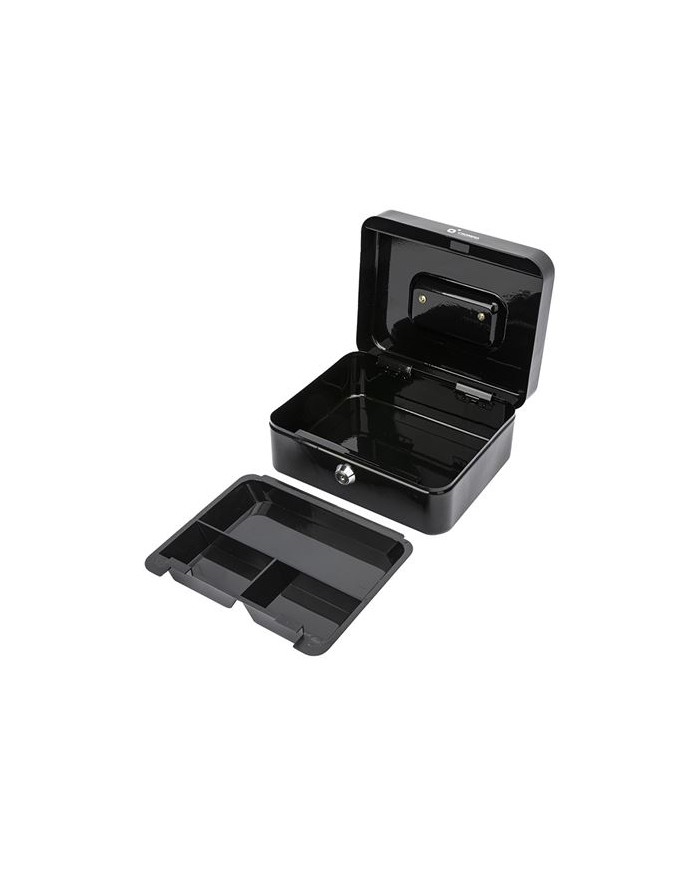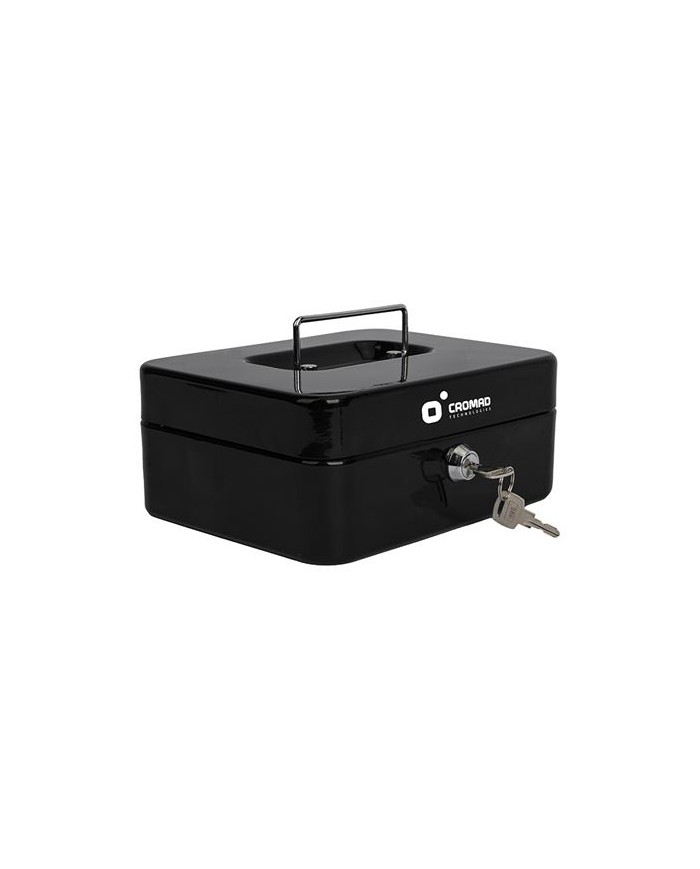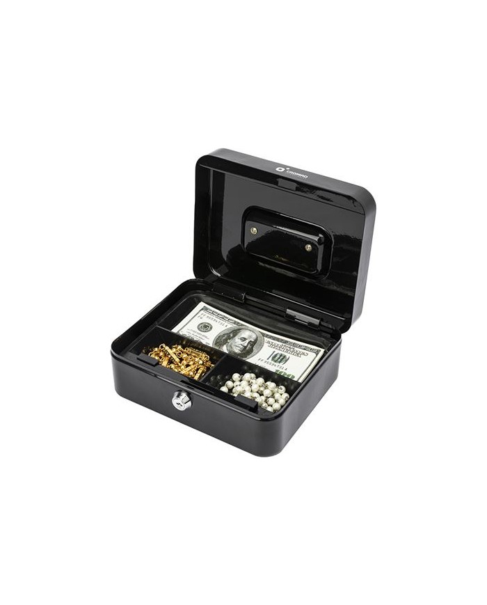 Caja de seguridad porttil con cierre mediante llave, ideal para el almacenamiento de efectivo, monedas, joyas y objetos de valor. Equipada con bandeja interior negra extrable que facilita la organizacin y el acceso. Perfecta para uso domstico o profesional en oficinas, comercios y ferias. Cierre con llave: Incluye llave para una apertura y cierre seguros. Bandeja negra extrable: 3 compartimentos para monedas y objetos pequeos. Asa metlica: Facilita el transporte. Uso verstil: Ideal tanto para el hogar como para negocios. Dimensiones: 90 x 200 x 160 mm Peso: 0.9Kg