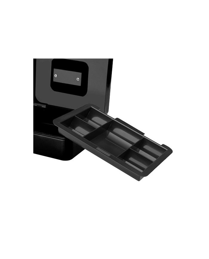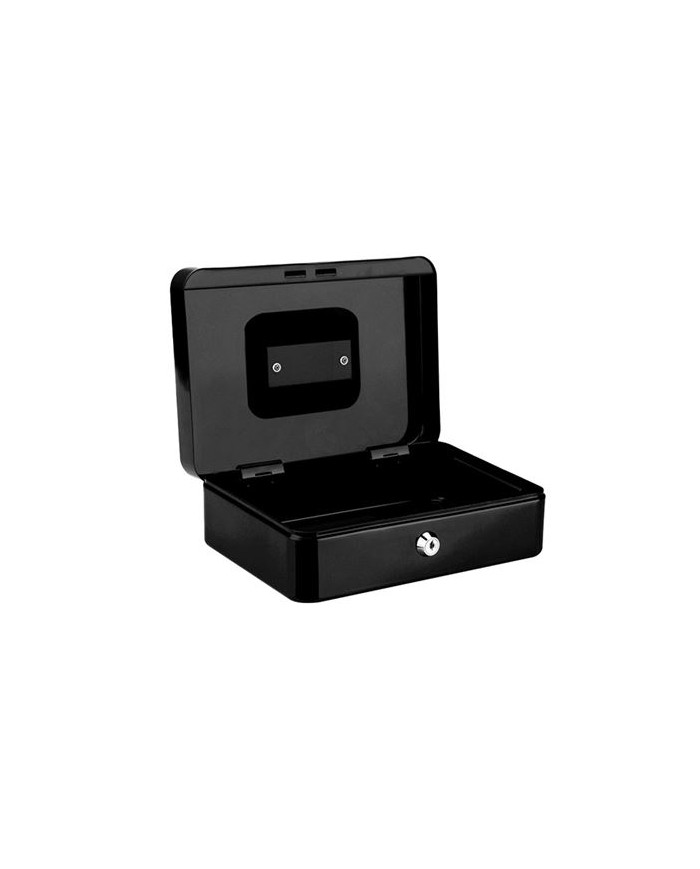Caja de seguridad porttil con cierre mediante llave, ideal para el almacenamiento de efectivo, monedas, joyas y objetos de valor. Equipada con bandeja interior negra extrable que facilita la organizacin y el acceso. Perfecta para uso domstico o profesional en oficinas, comercios y ferias. Cierre con llave: Incluye llave para una apertura y cierre seguros. Bandeja negra extrable: 5 compartimentos para monedas y objetos pequeos. Asa metlica: Facilita el transporte. Uso verstil: Ideal tanto para el hogar como para negocios. Dimensiones: 90 x 250 x 180 mm Peso: 1Kg